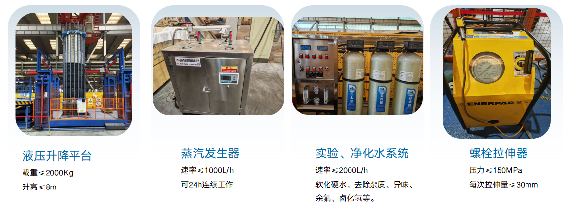 公司具备5/20/200/1000标方碱性电解槽的生产条件、总装装备和检测装备。配备10吨行车及电解槽装配液压升降平台、PPS隔膜剪裁机、蒸汽发生器、螺栓拉伸器、螺栓顶升机等专用装备,具备标准电解槽质量控制过程管理和工艺能力。